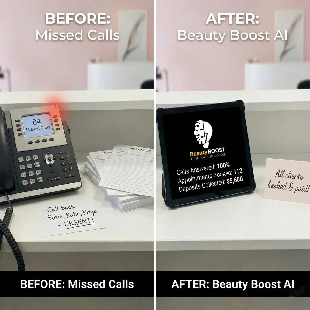 “We were missing over 40% of our calls before BeautyBoost AI. Now every call is answered and our bookings have gone up dramatically. It feels like we hired a full-time receptionist without the cost!”